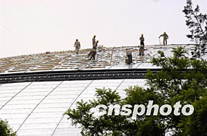 五月初,地處北京市中心的國家大劇院建筑工地上,建筑工人在雨季來臨前站在建筑穹體表層,加緊安裝金屬保護結構。該建筑由國家財政投資三十億元興建,目前穹頂建筑施工是該建筑最具難度的施工項目之一。中新社記者:鄒憲