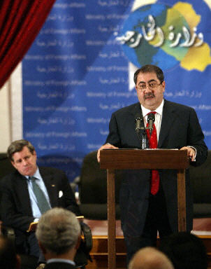 伊拉克臨時政府外交部長茲巴里則(右)在權力移交儀式上發表講話