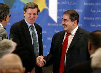 移交儀式結束后,伊拉克臨時政府外長茲巴里(右)與美駐伊最高文職行政長官布雷默握手。