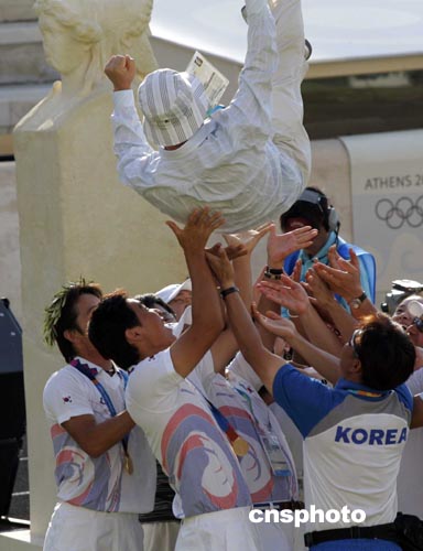 圖為獲勝后,韓國隊員將教練高高拋起。