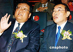 圖為香港中聯辦副主任王鳳超(右)在放映會上聽鳳凰衛視董事局主席劉長樂介紹影片情節。
