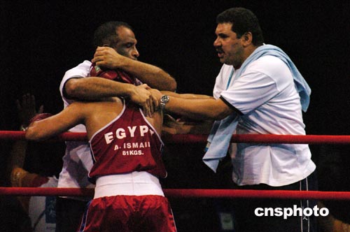 埃及選手擊傷希臘選手后,有觀眾向場內扔硬物,埃及教練緊張地護著愛徒。