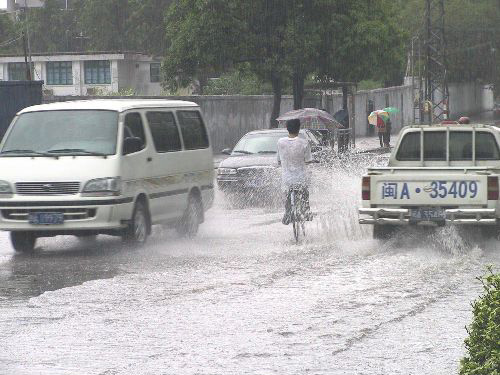 八月二十五日下午五時左右,臺風“艾利”即將登臨,福州突降狂風暴雨,致使許多馬路排水系統崩潰,路面上積水成災。作者:王東明