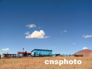 從格爾木出發,沿青藏公路驅車在三百二十公里,在青藏公路和鐵路線之間的山崗上,藍天白云下一幢紅頂藍墻的塑鋼建筑格外醒目。它就是青藏鐵路北麓河試驗段的大本營——中科院凍土工程國家重點實驗室青藏高原研究基地。