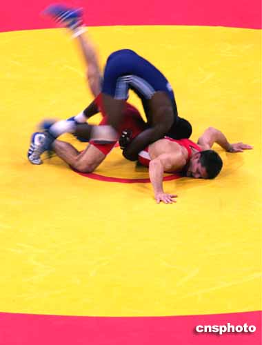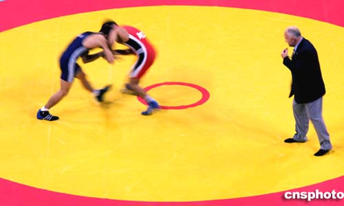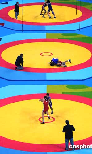 圖為當地時間8月25日進行的男子六十公斤以下級摔交比賽現場。