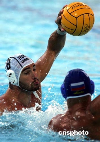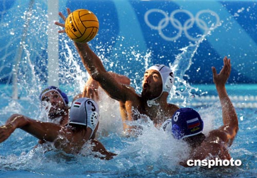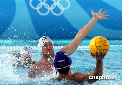 當?shù)貢r間8月27日下午,雅典奧運會男子水球比賽進入白熱化階段,匈牙利隊(白帽)以7比5擊敗志在奪取金牌的俄羅斯隊,率先闖入決賽。中新社記者:任晨鳴