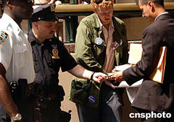 當地時間八月二十七日,距離美國共和黨大會開幕還有三天,紐約麥迪遜廣場花園附近已經開始嚴密警戒,圖為一名年輕的布什反對者(右二)受到警察的盤查。作者:趙海燕