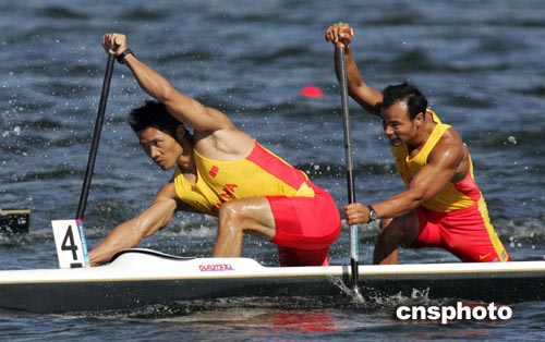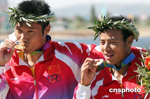中新社北京八月二十八日電 雅典奧運(yùn)會(huì)男子雙人劃艇五百米項(xiàng)目的金牌被中國(guó)選手孟關(guān)良/楊文軍摘得。該枚金牌也因此載負(fù)了眾多“歷史意義”。