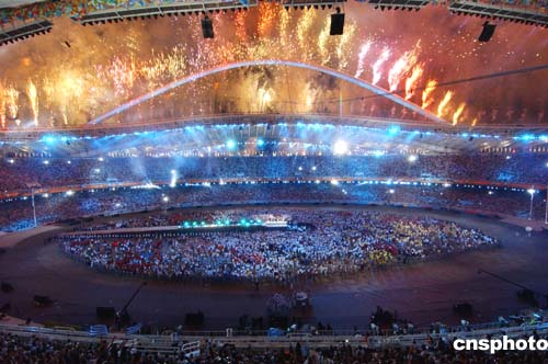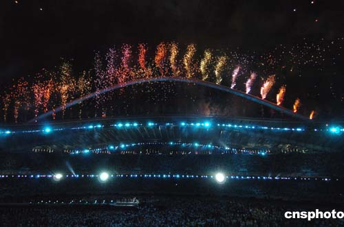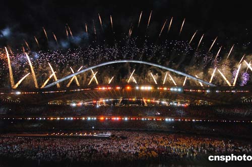 在當地時間29日舉行的2004雅典奧運會閉幕式上,焰火在奧林匹克運動場上空綻放。