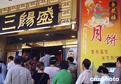九月二日,滬上一家月餅廠家推出新品吸引眾多市民排隊爭購。雖然中秋未至,但是上海諸多月餅廠家競相推出新品絕招,希冀搶占一年一度的月餅市場。作者:潘索菲