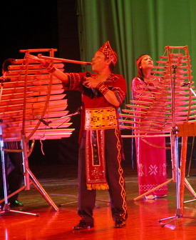 竹制樂器的演奏是越南藝術(shù)表演中獨具特色的,竹琴據(jù)介紹是仿鋼琴制成的,音色清脆,節(jié)奏明快,表演者的雙手在竹鍵上彈奏,速度快得讓觀眾眼花繚亂;德朗琴是用線將長短不一的竹筒自上而下排掛在一個琴架上,敲擊琴筒的兩根細棒頂端各固定一個圓球,球上罩著一層布,敲擊竹筒時琴聲似幽谷回響;klong put琴由一排粗細有別的竹筒制成,演奏者根據(jù)每個竹筒的固定音調(diào),用手在筒端變換敲擊出舒緩綿長的曲調(diào)來;還有一個孔的簫,遠遠看去吹蕭人將蕭橫托在面前,用手在蕭的遠端一開一合地掌握音階,仿佛中國蕭從小孔開合變換里發(fā)出的聲音,都從越南吹蕭人的手中魔幻般地變了出來。這些樂器既有獨奏,又有合奏,兼有表演的觀賞與聽覺的雙重效果,極具藝術(shù)魅力。