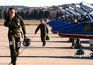 中新網9月7日電 日前,法國空軍飛行表演隊先遣組組長讓·馬克在北京透露,“法蘭西巡邏兵”飛行表演隊10月將隨希拉克總統到訪北京,在北京南苑機場舉行兩場表演,然后赴武漢、珠海、香港巡演。法蘭西巡邏兵是世界五大特級飛行隊之一,此次隨總統出訪是第一次。表演隊使用阿爾法噴氣教練機。此次表演由國防部外事辦公室和空軍有關單位主辦。中新社記者:鄭萍萍