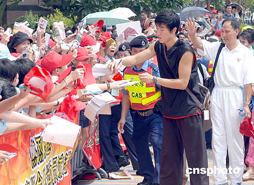 國家奧運金牌代表團9月7日在香港展開觀光之旅,金牌選手分別在香港多處名勝景點參觀,所到之處均深受廣大市民熱烈歡迎,在雅典奧運勇奪田徑110米欄金牌的劉翔在尖沙咀星光大道參觀,并為小學生簽名留念。作者:鄧慶樂