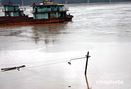 圖為重慶市渝中區化龍橋一處被淹,只剩一根電桿尚余頂部露出水面。