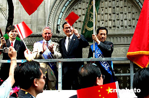 中國(guó)駐紐約總領(lǐng)事劉碧偉(右二)和國(guó)際移民基金會(huì)負(fù)責(zé)人(右三)一起在主席臺(tái)上向中國(guó)移民游行隊(duì)伍致意。