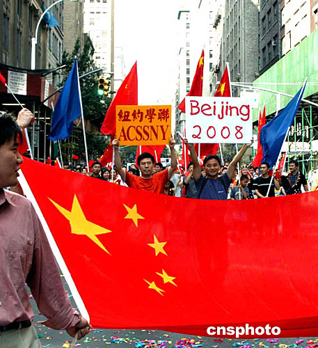 參加游行的紐約中國(guó)留學(xué)生高舉"BEIJING二00八"的標(biāo)語(yǔ)牌,預(yù)祝北京奧運(yùn)成功。