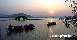 正在浙江舉行的第七屆中國藝術節將于九月二十六日晚在紹興舉行閉幕式。圖為夕陽中的紹興古鑒湖。浙江紹興乃江南名城,素有“水鄉澤國”之稱,水巷彎彎,流韻蕩漾,是一座具有兩千四百多年歷史的文化名城。作者:袁胤