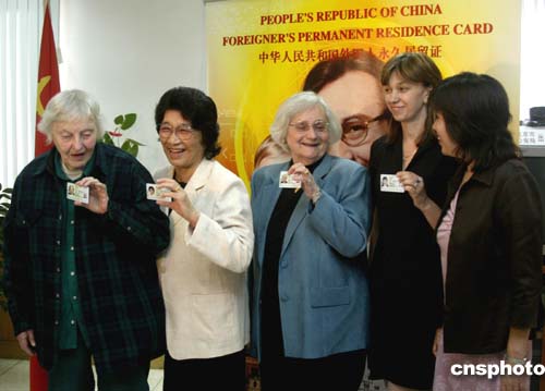 中新社北京九月二十一日電(記者 吳慶才)今天,北京市公安局出入境管理處為北京農業機械化科學院的美國專家寒春等五名在京外國人頒發了《外國人永久居留證》。他們將與其他二十三名外國人一起成為首批在北京獲得“綠卡”的外國人。