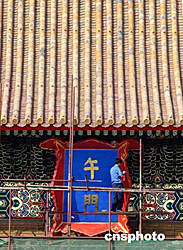 九月末,一名工人正在高高的北京故宮午門匾額處進行維修。北京故宮正在進行自建成以來最大規模的修繕,到2005年10月之前將完成第一階段的大修,主要進行午門、欽安殿和中軸線周圍廡房的維修。故宮大修工程將于2020年全部完成。對正在進行的故宮修繕工程質量,各方人士莫衷一是。中新社記者:張煒