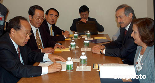 當(dāng)?shù)貢r(shí)間九月二十七日,出席第五十九屆聯(lián)大的中國外長(zhǎng)李肇星(左)在紐約聯(lián)合國總部會(huì)見了智利外長(zhǎng)索萊達(dá)·阿爾韋亞爾(右)。作者:趙海燕