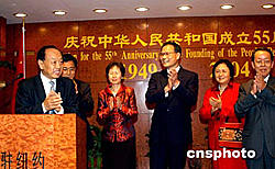 當地時間九月二十九日晚,正在紐約聯合國總部出席第五十九屆聯大的中國外長李肇星(左)前往中國駐紐約總領館,與當地僑胞共同歡度中華人民共和國成立五十五周年。圖中從右至左為:中國常駐聯合國代表王光亞和夫人、中國駐紐約總領事劉碧偉和夫人、中國常駐聯合國副代表張義山。作者:趙海燕