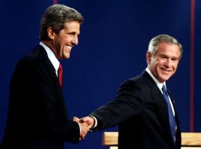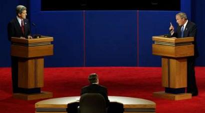 兩位候選人,一位是總統,一位是參議員,皆出自富家名校,又都伶牙俐齒,在辯論場上也已身經百戰,不過,布什作為在任總統,又在民意調查中小占上風,加上在伊拉克戰爭上、尤其在反恐工作中得到許多選民認可,他似乎只要在辯論中保持不敗即可站穩腳跟。