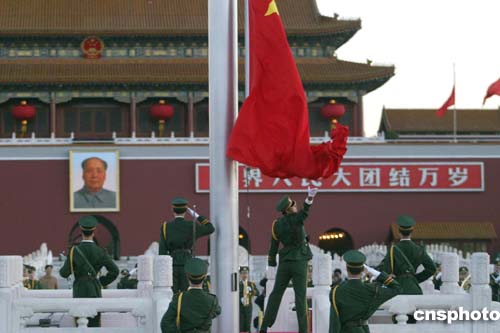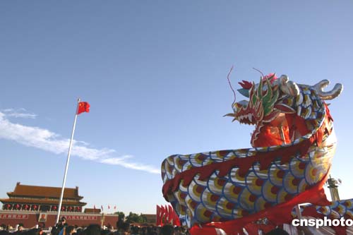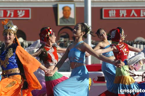 艷陽、大風,北京第五十五個國慶日,天安門前人肩勝花海。