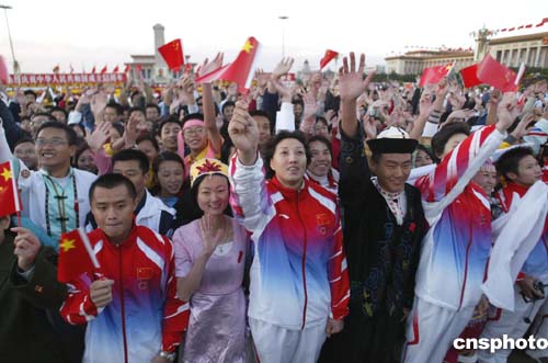 而另一位表情同樣親和的偉人,孫中山先生,其像在城樓對面廣場上矗立。來自北京各高校及其他各界人士,此時正在廣場歡歌起舞。一小時半前,他們剛剛在此觀看了升旗儀式。那一刻,近處奧運倒計時器的顯示為一千四百零七天十二小時零五十一分鐘。
