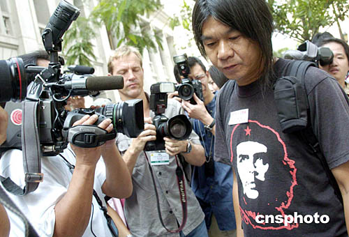 引人爭議、外號“長毛”的梁國雄,10月6日出席香港新一屆立法會首次會議宣誓就任立法會議員。他按照立法會誓辭宣誓前,大聲狂呼。立法會部分議員對梁國雄的宣誓方式表示遺憾,認為議員需要遵守議事規則。有輿論指“長毛”行為出位,實有作秀之嫌。圖為梁國雄在進入立法會大樓前受到大批傳媒及警方“關照”。作者:洪少葵