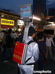 時(shí)下,廣告幾乎在上海無(wú)孔不入。圖為國(guó)慶黃金周之夜,身背多媒體液晶顯示器的廣告人在上海徐家匯人群密集地帶串街走巷。作者:潘索菲