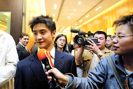 當“跳水王子”身著筆挺的意大利西裝走到簽到臺前時,記者們瘋了似地沖將過去,電視臺的編導激動地將話筒伸到田亮嘴邊,讓他說說郭晶晶,談談港商。雙眼略顯紅腫的田亮在經紀人的保護下低頭讓過,對任何問題不予應答。經紀人劉先生稱,田亮剛剛從美國乘坐了34個小時的飛機到達北京,其間轉乘了4個航班,非常勞累,因此不便接受采訪。(記者 胡雪柏王錚)