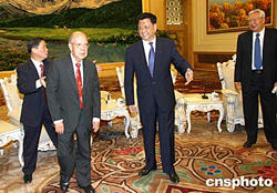 十月十二日在北京人民大會(huì)堂,全國(guó)政協(xié)常務(wù)副主席王忠禹(右二)、全國(guó)政協(xié)副主席羅豪才(右一)會(huì)見(jiàn)出席《紀(jì)念陳嘉庚先生誕辰130周年座談會(huì)》的陳嘉庚先生七子陳元濟(jì)等親屬。