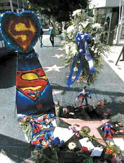 享年52歲的“超人”克里斯托夫·里弗墜馬癱瘓后對抗病魔的毅力與勇氣深植影迷心中,從10月11日開始,在美國好萊塢星光大道上,人們駐足拍攝擺放在已故演員克里斯托夫·里弗名字前的照片、短信和鮮花。而當(dāng)年《超人》電影在紐約的拍攝景點(diǎn)——“超人”擔(dān)任記者的報(bào)社大樓,也有許多影迷前往憑吊。電影中,“超人”每天上班的報(bào)社“DAILYPLANETNEWS”所在的大樓,隨著電影的走紅而有了“超人大樓”的稱號,所以在克里斯托夫·里弗過世的消息傳出后,紐約人紛紛來到這里懷念心中的偶像。一名紐約影迷說:“這是‘超人’大樓,大家都會來這里看有名的地球標(biāo)志,這同時(shí)也是新聞大樓,是有名的觀光景點(diǎn)。”