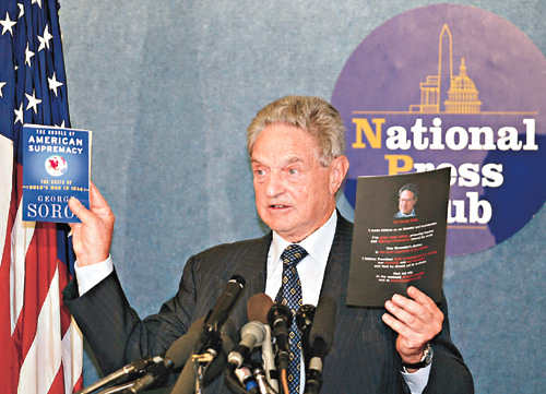 索羅斯除了捐款給其它反布什團體,自己也斥巨資登廣告出書及巡回演講呼吁選民推倒布什,估計他個人為這次大選最終要花二千五百萬美元。這是索羅斯第一次公開大規模介入美國選舉。他在其出版的一本反布什的書中說,布什政府中的強硬派正利用恐怖主義的威脅,來追求他們自己想維持美國軍事優勢的目標。“而這種追求,則會繼續引發抵制,啟動惡性暴力循環”。