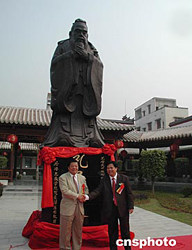 圖為在開幕儀式上揭幕的香港孔教學(xué)院院長湯恩佳博士(左)捐贈的孔子銅像。