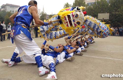 十月十八日,第五屆農民運動會的舞龍比賽三個項目的預賽在江西省宜春進行,這三個項目比賽分別為抽簽舞龍、障礙舞龍和競速舞龍。圖為云南代表隊在賽場外進行抽簽后的動作組合訓練,準備參加抽簽舞龍比賽。同時,第五屆農民運動會盛大的開幕儀式將于今天晚上八點在宜春市體育中心進行。作者:盛佳鵬