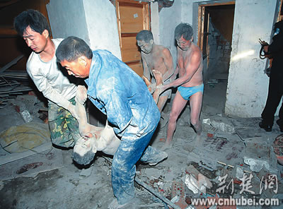 報道稱,工棚內住有民工23人,早已熄燈睡覺。巨響之后,工棚內立即傳出呼救聲。未被砸中的工人渾身是灰逃出來后,又折轉身去救人。因工棚配電箱被砸,他們摸黑搜索,搬開瓦礫救人,先后用雙手刨出5名工友。