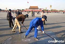 10月23日,清潔工人正在北京天安門廣場對已經發黑的花崗巖地面進行清洗。清洗工作完成后,廣場地面將恢復淡粉色原貌。清洗工作原計劃在十天內完成,但由于污漬太多,加上清理口香糖等污漬難度大,估計此次廣場大“洗臉”將會延期完成。作者:張煒
