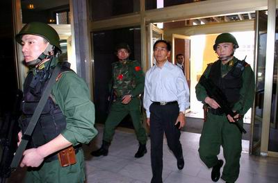 中國新任駐伊拉克大使楊洪林(右二)在武警戰士的護衛下步入使館駐地--巴格達曼蘇爾飯店。楊洪林是伊戰后中國首任駐伊拉克大使。 新華社記者 申宏 攝