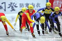 十月三十一日,2004/2005波司登國(guó)際滑聯(lián)短道速滑世界杯在北京首都體育館落幕,韓國(guó)隊(duì)發(fā)揮出色,包攬當(dāng)日比賽的全部六枚金牌。圖為復(fù)出后的中國(guó)首枚冬奧會(huì)金牌獲得者楊揚(yáng)(左二)在女子3000米接力比賽中。作者:武仲林