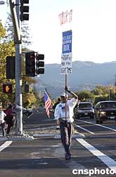 十一月二日美國將選舉新一任總統,在民主黨勢力雄厚的加州,為共和黨人布什助選的活動依然持續。圖為志愿者打著支持布什的標語牌在“硅谷”圣荷西市大街上孤獨行進。作者:陳鋼