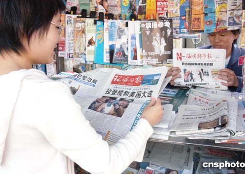 十一月三日是美國二00四年大選投票日,福州一名在校女大學生在市區街頭報攤閱讀國內多家報刊有關新聞,關注美國選情。作者:劉可耕