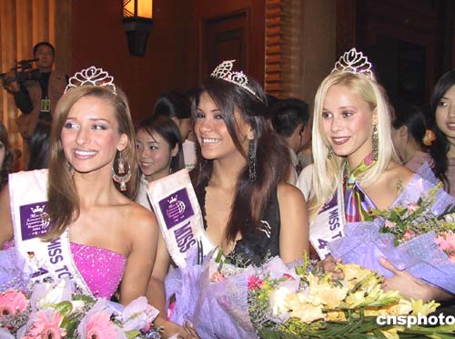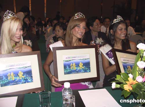 二零零五年國際旅游小姐冠軍總決賽中國四川賽區大賽啟動儀式十一月四日在成都舉行。二零零四國際旅游小姐大賽冠軍(中)、亞軍(左)以及獲得第五名的斯洛伐克小姐(右)為啟動儀式助興。作者:張華