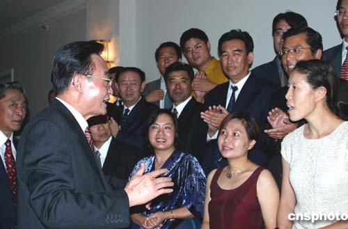 十一月五日正在贊比亞首都盧薩卡訪問的全國人大常委會委員長吳邦國看望了當(dāng)?shù)厝A人華僑、使館和中資企業(yè)工作人員。吳邦國在詢問中國農(nóng)墾總公司員工李莉有關(guān)情況后高興地表示,農(nóng)業(yè)在贊比亞大有可為。作者:張量