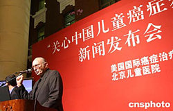 十一月十日晚,美國國際兒童癌癥治療(中國)聯合委員會主席威廉.牛頓教授在北京貴賓樓飯店“關心中國兒童癌癥基金”舉辦的新聞發布會上宣布:美國國際兒童癌癥治療(中國)聯合委員會將與北京兒童醫院合作,推出一系列公益資助計劃,聯手救助中國白血病患兒。中新社記者:史利