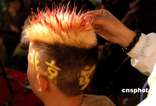 一位美發師在為參賽選手精心修剪,涵蓋了中國國旗圖案、“CHINA”和“2008”字母在參賽選手頭上。