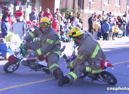 加拿大民意測驗中最受百姓喜歡的消防員腳踏迷你小摩托,當街表演。作者:蒲力