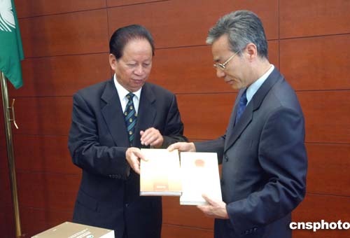 最高人民法院院長蕭揚向澳門終審法院院長岑浩輝贈送中華人民共和國法庫、人民法院案例庫光盤。作者:梁永強