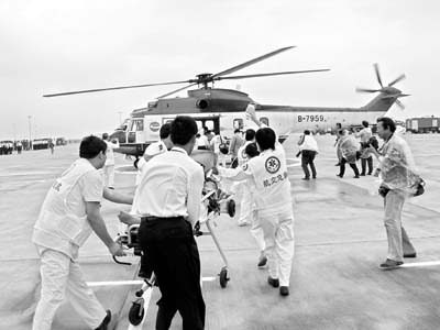 機(jī)場濃煙滾滾,兩輛消防車對(duì)準(zhǔn)飛機(jī)噴水,機(jī)組迅速打開艙門,施放緊急滑梯疏散旅客。機(jī)場醫(yī)療急救力量8輛救護(hù)車、60名擔(dān)架隊(duì)員也到達(dá)現(xiàn)場,醫(yī)療人員根據(jù)受傷輕重分別在場地上不同區(qū)域插上紅、黃、綠、黑、白五色旗,擔(dān)架隊(duì)員抬著擔(dān)架沖向失事飛機(jī)迅速將傷員轉(zhuǎn)離飛機(jī),送往臨時(shí)搭建的醫(yī)療驗(yàn)傷區(qū)。
