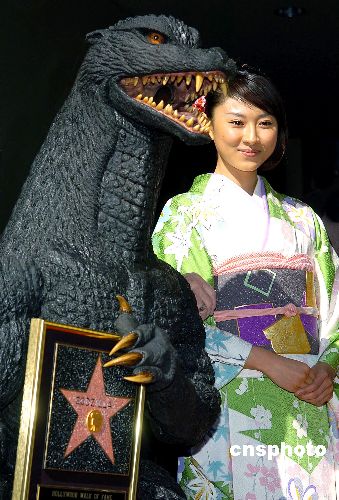 11月29日,又一位明星被載入美國好萊塢星光大道,成為這條大道上的第2271顆星。不過,這位明星并非人類,而是曾經令無數觀眾癡迷的巨怪“哥斯拉”。這個日本人創作的恐怖災難片巨星在美國與“金剛”齊名,可謂是家喻戶曉。圖為“哥斯拉”在留名典禮上,在這個重要場合,連它也少不了美女相伴。Ic/cnsphoto